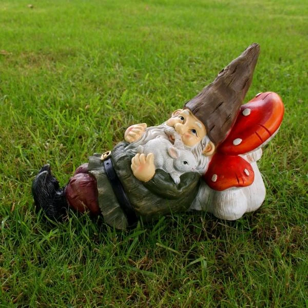 Genietend van zijn middagdutje in gezelschap van zijn vriend konijn rust deze tuinkabouter op de paddestoelen. Een originele tuindecoratie voor het hele gezin.