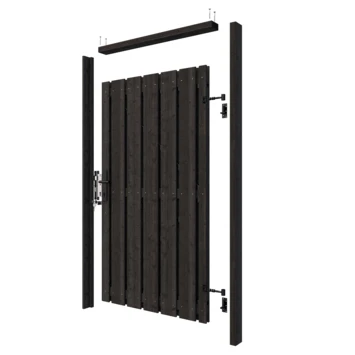 De tuindeur recht grenen geschaafd geïmpregneerd en gedompeld antraciet op zwart stalen frame is 180 cm hoog, 100 cm breed, 5,5 cm diep en heeft weinig doorkijk. De tuindeur bestaat uit 13 verticale planken die met RVS schroeven op een zwart stalen frame zijn vastgemaakt. De tuindeur is tweezijdig, kan zowel links- als rechtsdraaiend gemonteerd worden en wordt inclusief hengen geleverd.