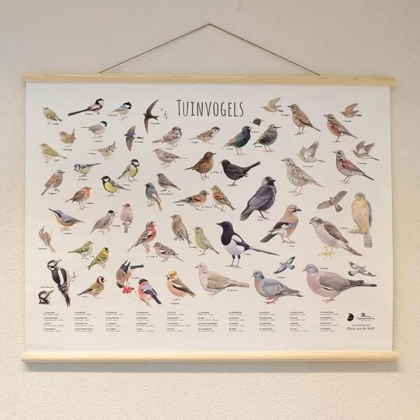 Prachtige wanddoek met 40 gedetailleerde illustraties van tuinvogels door Elwin van der Kolk.